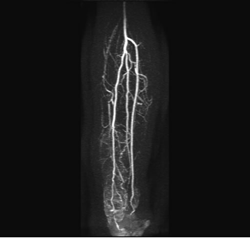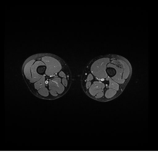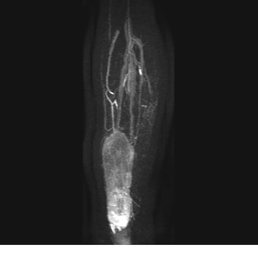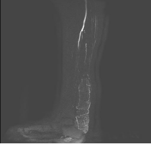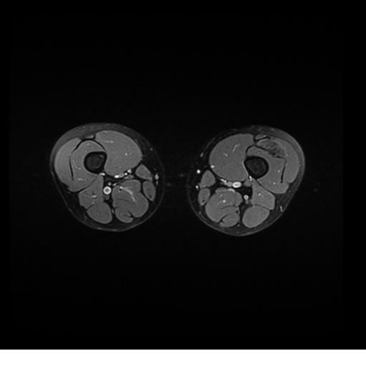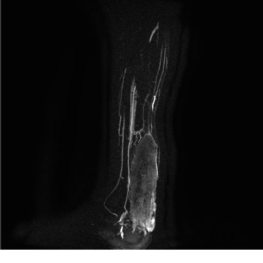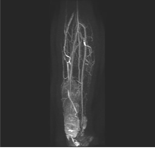 El estudio demuestra masa a nivel de los músculos gemelos, más evidente en secuencia con pulso de saturación de grasa, en el estudio de angio resonancia de pierna la fase arterial no muestra ninguna anormalidad, en la fase venosa se observa acumulo del medio de contraste a este nivel.