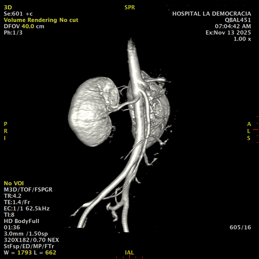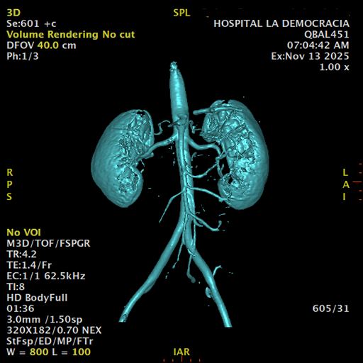 Paciente de sexo femenino, de 45 años de edad, refiere infecciones urinarias a repetición, no hay dolor, no refiere trauma, consulta por ardor al orinar, medico tratante le solicita resonancia abdominal, con énfasis en riñones, además un estudio de angiorenal.