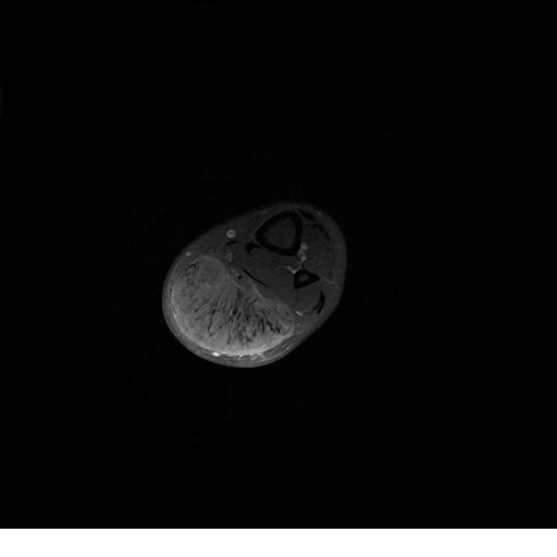 El estudio demuestra masa a nivel de los músculos gemelos, más evidente en secuencia con pulso de saturación de grasa, en el estudio de angio resonancia de pierna la fase arterial no muestra ninguna anormalidad, en la fase venosa se observa acumulo del medio de contraste a este nivel.