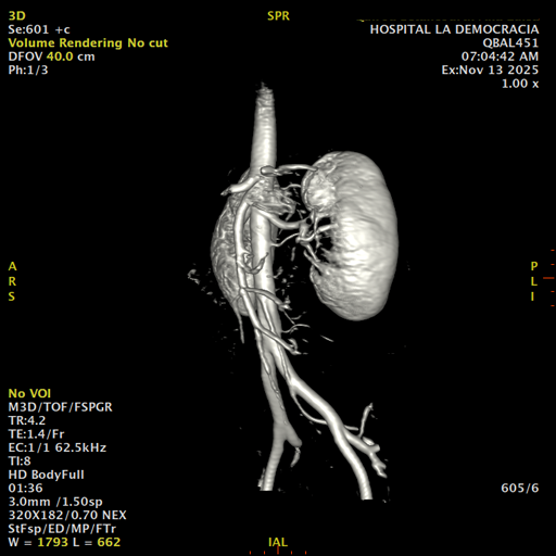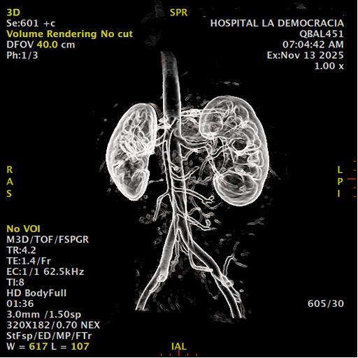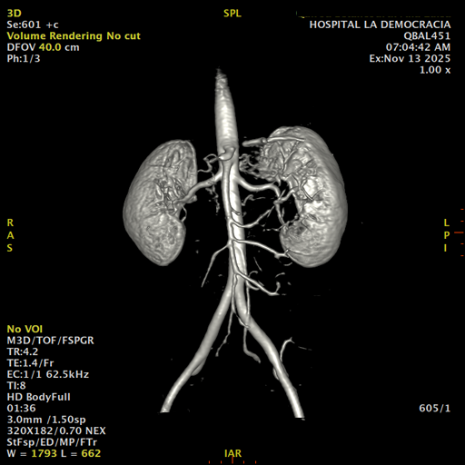 Paciente de sexo femenino, de 45 años de edad, refiere infecciones urinarias a repetición, no hay dolor, no refiere trauma, consulta por ardor al orinar, medico tratante le solicita resonancia abdominal, con énfasis en riñones, además un estudio de angiorenal.